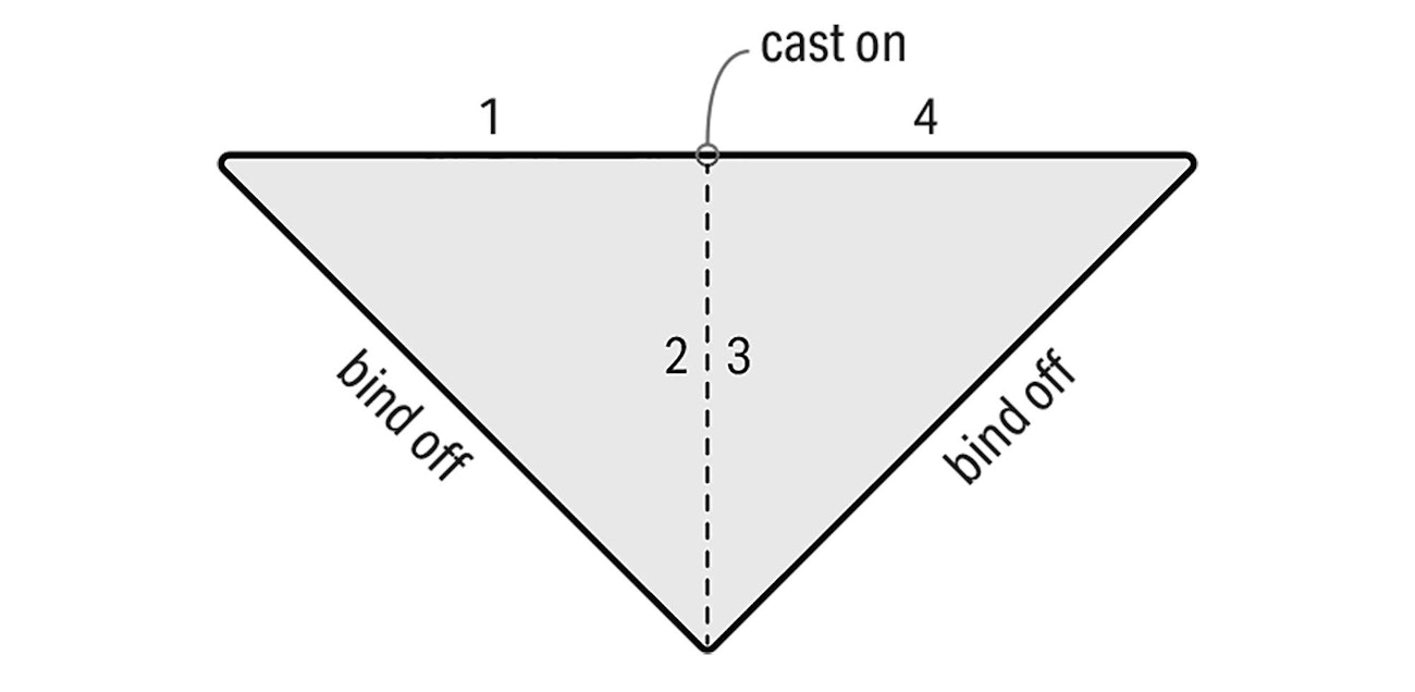 These increases serve to create two triangles that expand from the top outward, on either side of a central spine (marked here with dots). The final rows and bind-off occur across the long bottom edges of the triangle(s). This orientation gives the knitting a diagonal look, which is lovely when decorated with lace or other stitch patterns.