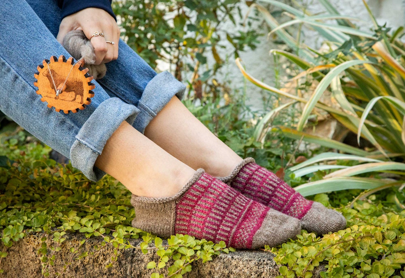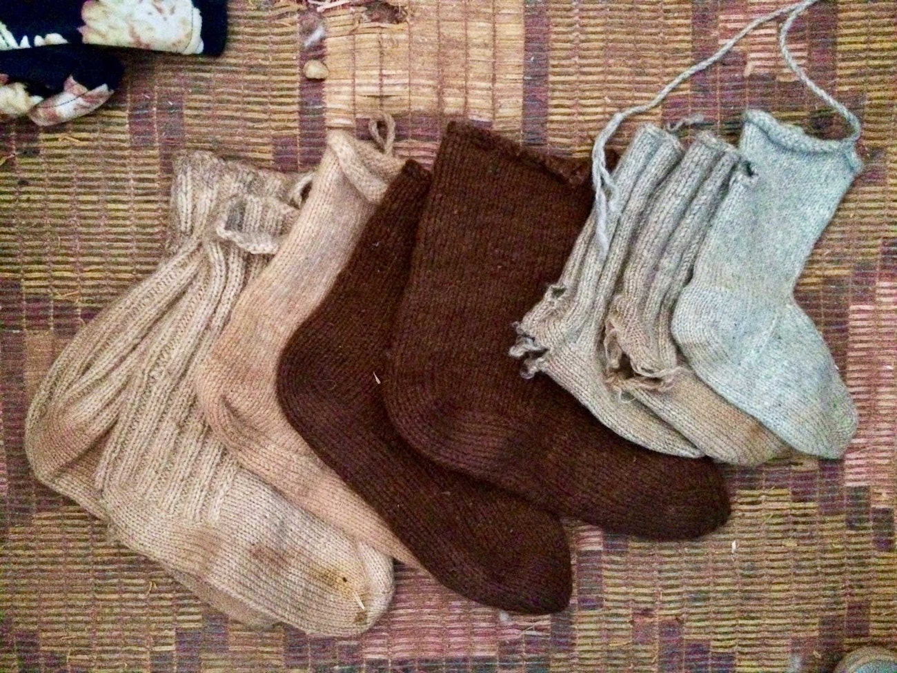 I laid out the socks in a variety of sizes and shades of cream, brown, and gray. Some were clearly for children while others must have been worn by adults. All had the distinctive tail from the cuff that enabled the wearer to hang the socks up to dry. One woman showed me that the tail was tied around the leg to keep the socks from slipping down and the cuff snug around the wearer’s pants leg, which they liked to tuck into their socks. The heels appeared to be a type of flap or band heel, and there were no gussets at the ankles.