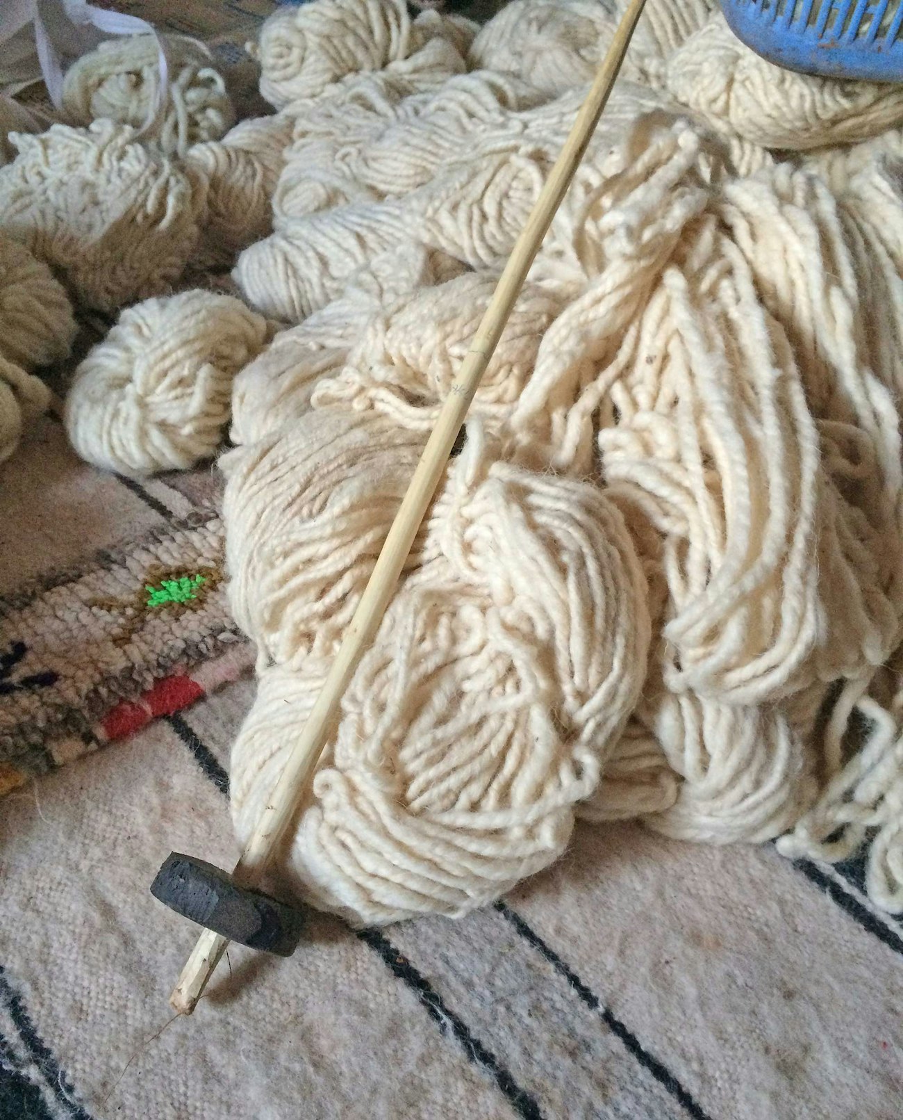 I went from group to group and talked with the women about the different types of wool yarn they were spinning. Some were making the loosely spun tilmi I had seen on my first visit to Timloukine. Others were spinning up a more tightly spun, two-ply ibilou yarn, which is cut into finger-length pieces and tied around the warp threads on a loom to create the thick pile characteristic of Amazigh carpets in Morocco.