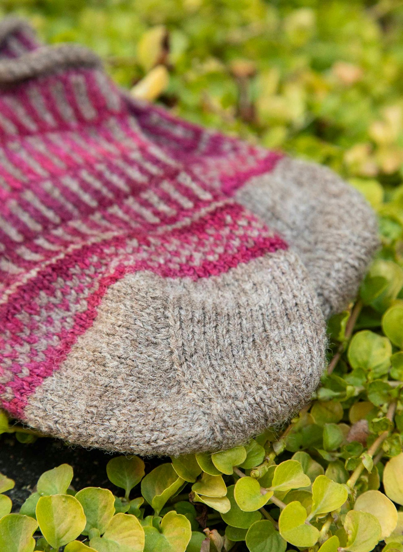 The pair shown here is knitted in DK-weight handspun. You can use any yarn you like, and the pattern includes some simple adjustments for yarn weight and finished size. Beginning with a diamond toe, the socks are knit-to-fit. Increase until the toe has enough stitches for your foot, and off you go!