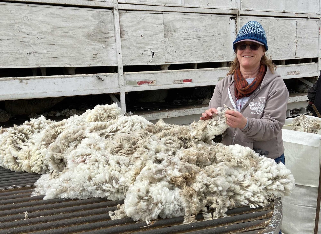Lani Cockrell, a certified wool classer, skirts her Rambouillet fleeces during spring shearing at the Bare Ranch.