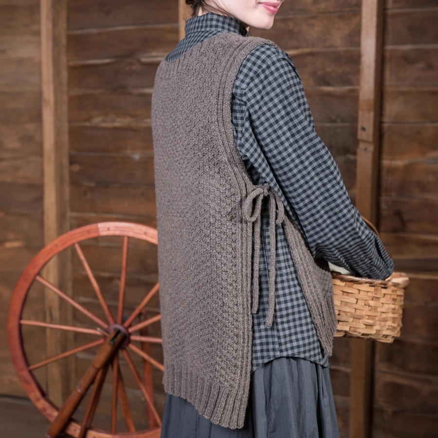 * The vest is worked bottom up from the hemline, first the back and then the front. It has a high-low hemline, with the back three inches longer than the front.