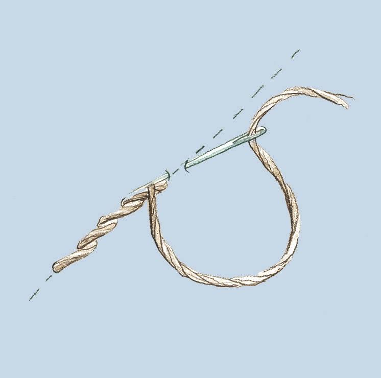 See if the needle is pointing in the direction the stitches are forming, at an angle to them, or in the opposite direction. (Examples from the top row below: For chain stitch, the needle points in the direction the stitches are forming. For blanket stitch, the needle is perpendicular to the row of stitches. For stem stitch, the needle is pointing the opposite direction.)