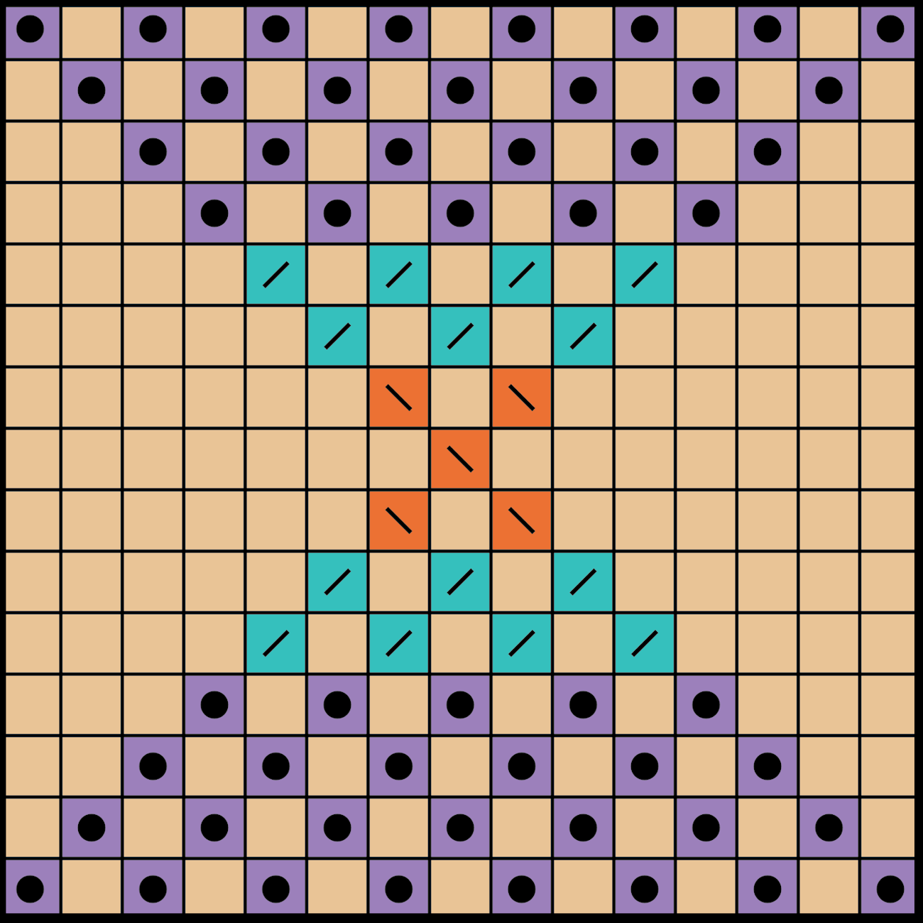 The background is shown with cream blocks, and the pattern is purple, turquoise, and orange. All of the pattern blocks could be converted to purple. This reduces the complexity of the pattern, which might make it feel more manageable to knit—or to find enough yarn colors you like.