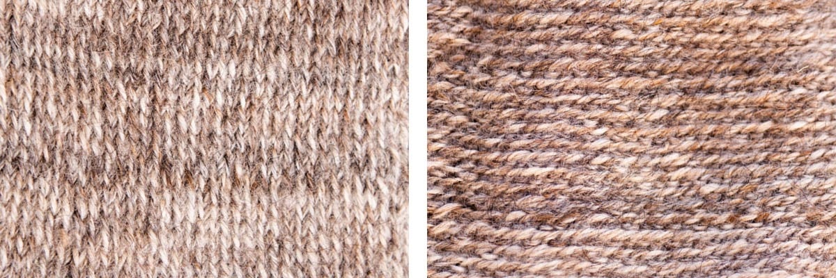 The Z-plied yarn swatch (left) feels smoother than the S-plied yarn swatch (right). The left halves of the S-plied stitches are a bit tilted and higher than the right halves of the stitches.