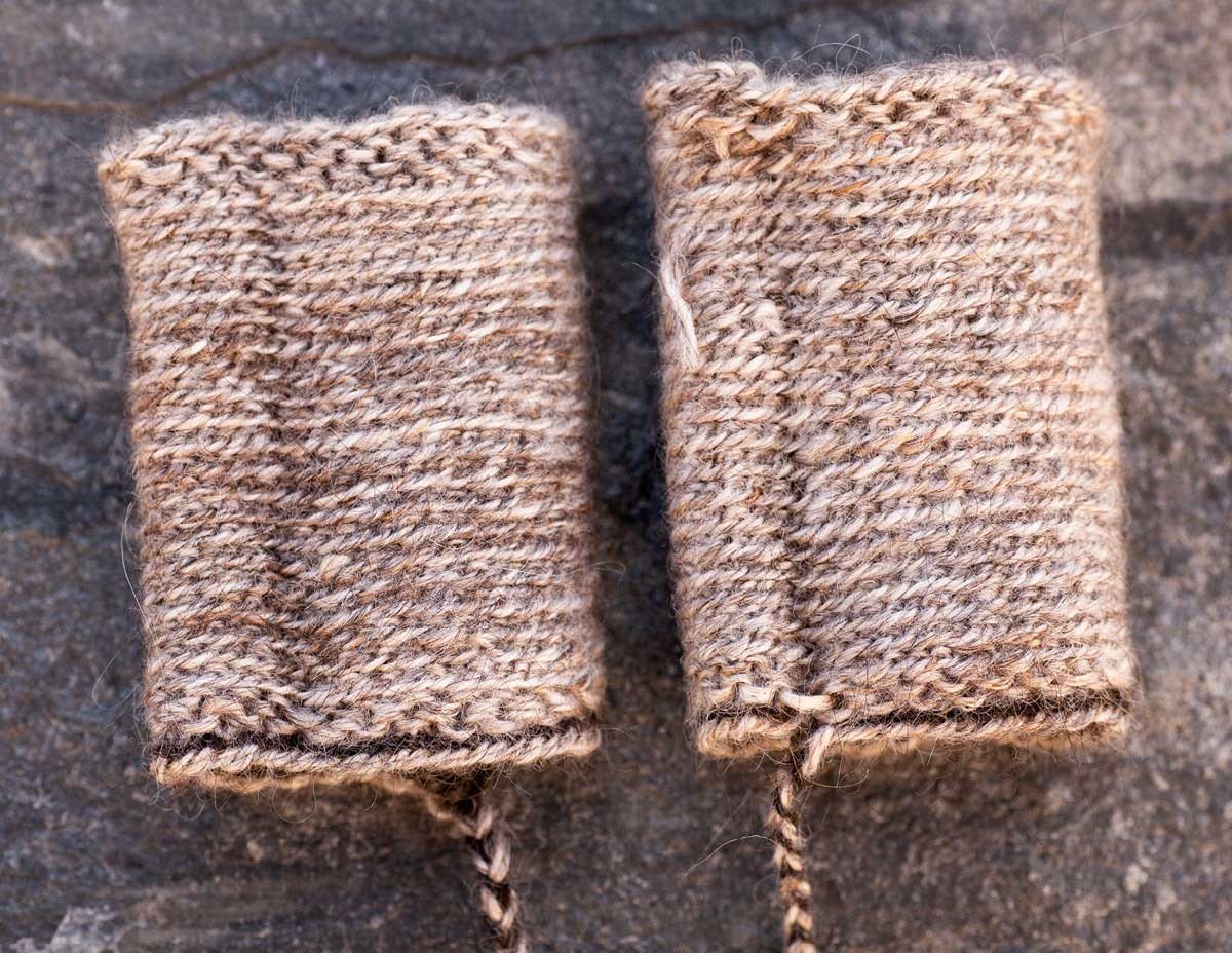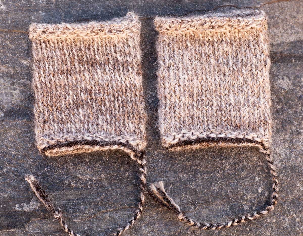 A two-end-knitted fabric is strong and sturdy, firm but not bulky. The combination of the smooth vertical stitches on the right side and the twisted and horizontal texture of the wrong side makes a dense grid-like structure that withstands the elements. The fact that the working yarn changes every other stitch also makes a two-end-knitted garment more durable. Add fulling as a finishing treatment, common for two-end-knitted items, and it is easy to understand why these garments last a lifetime. Twined knitting has a rich history in Sweden and Norway, where it was used for sturdy work mittens with the twined ridges on the outer sides of the mittens.