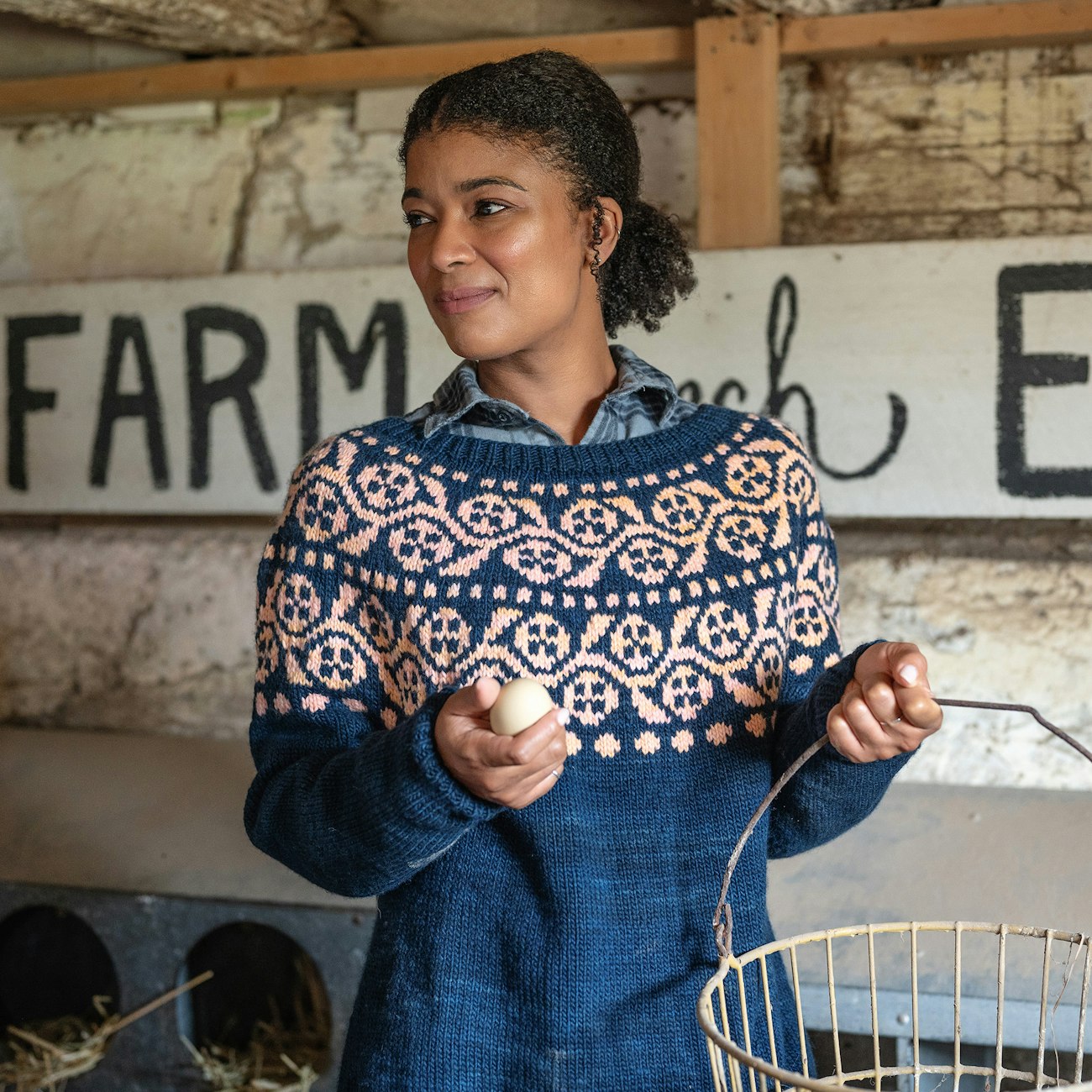 There were still plenty of options to try. Combining Meltaway Mints with Fjord in the Ideal yarn line created better contrast and a more successful pairing. You might not immediately think to combine a four-ply yarn and a single-ply yarn in colorwork, but a plied yarn in the body of the sweater will give it better durability, and the contrast in ply structure can also create an interesting contrast in surface texture in the colorwork section.