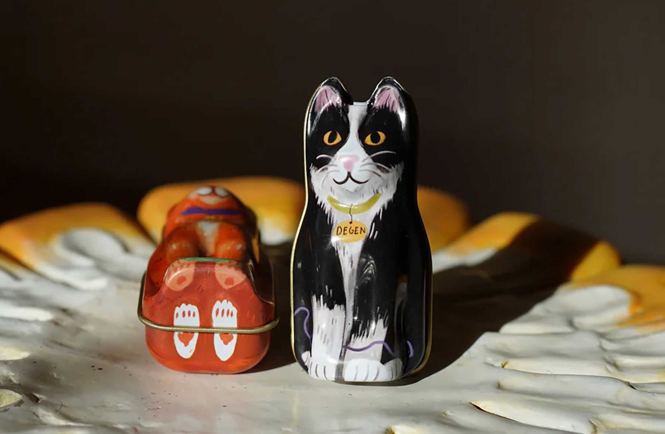 At just under 3" (7.6 cm) high, these cat tins by DEGEN are just the right size to hold stitch markers, tapestry needles, and other small notions. Photo courtesy of Degen