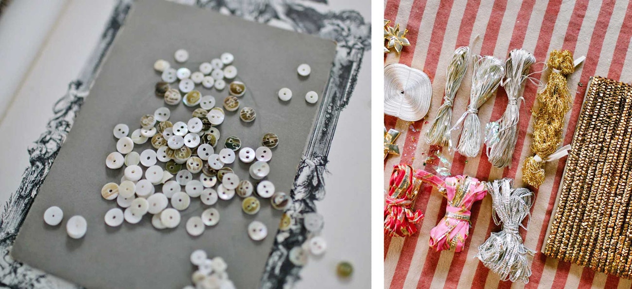 The delicate shell buttons offered by Skippy Cotton were hand-collected in India and would be the perfect addition to both modern and heirloom garments. At right, a curated collection of vintage ribbons and embellishments from India includes shimmering textures and a variety of finishes. Photos courtesy of Skippy Cotton