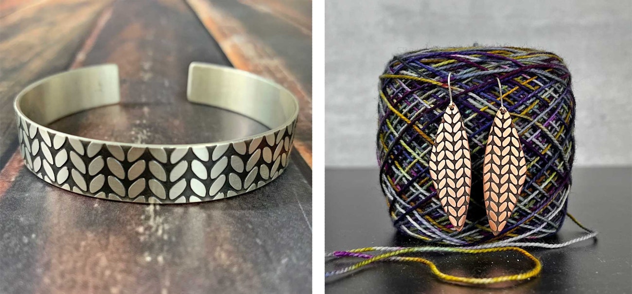 These great cuffs and earrings made by Kristi Jensen are available in copper, brass, and satin-finished sterling silver, with the option of a stockinette or garter stitch motif. Photos courtesy of Birdie Parker Designs