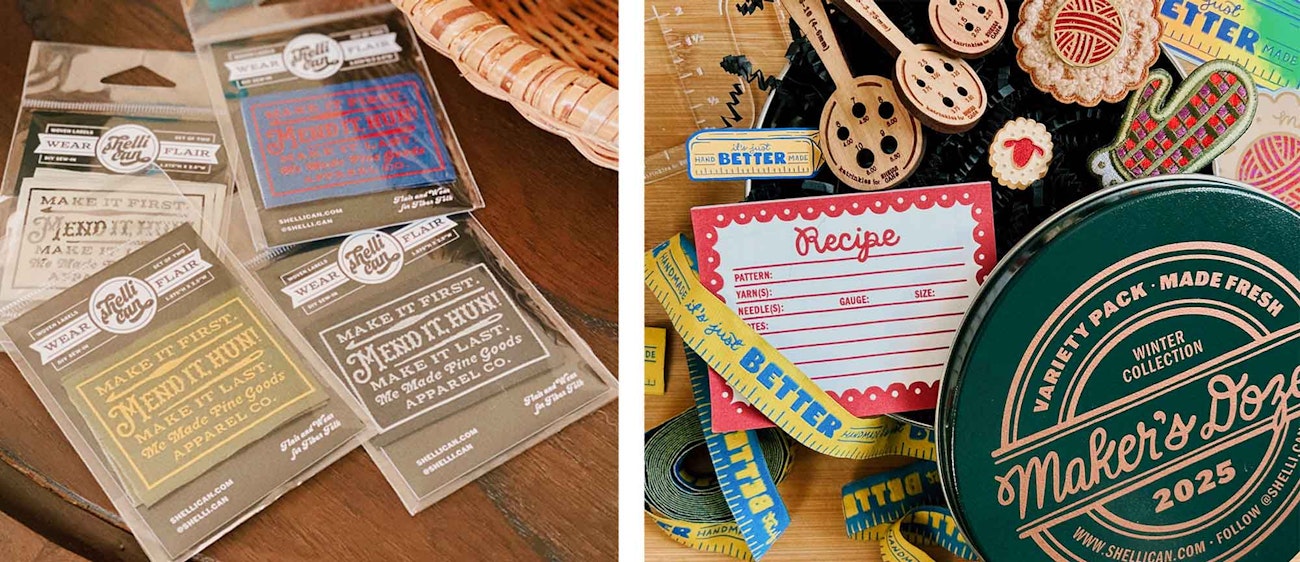 The Mend It Hun sew-in label is a favorite of the author’s. And the Maker’s Dozen Treat Tin contains ribbon, labels, needle gauge, ruler, enamel pins, and more—baking themed and tucked into a custom printed cookie tin. Photos courtesy of Shelli Can