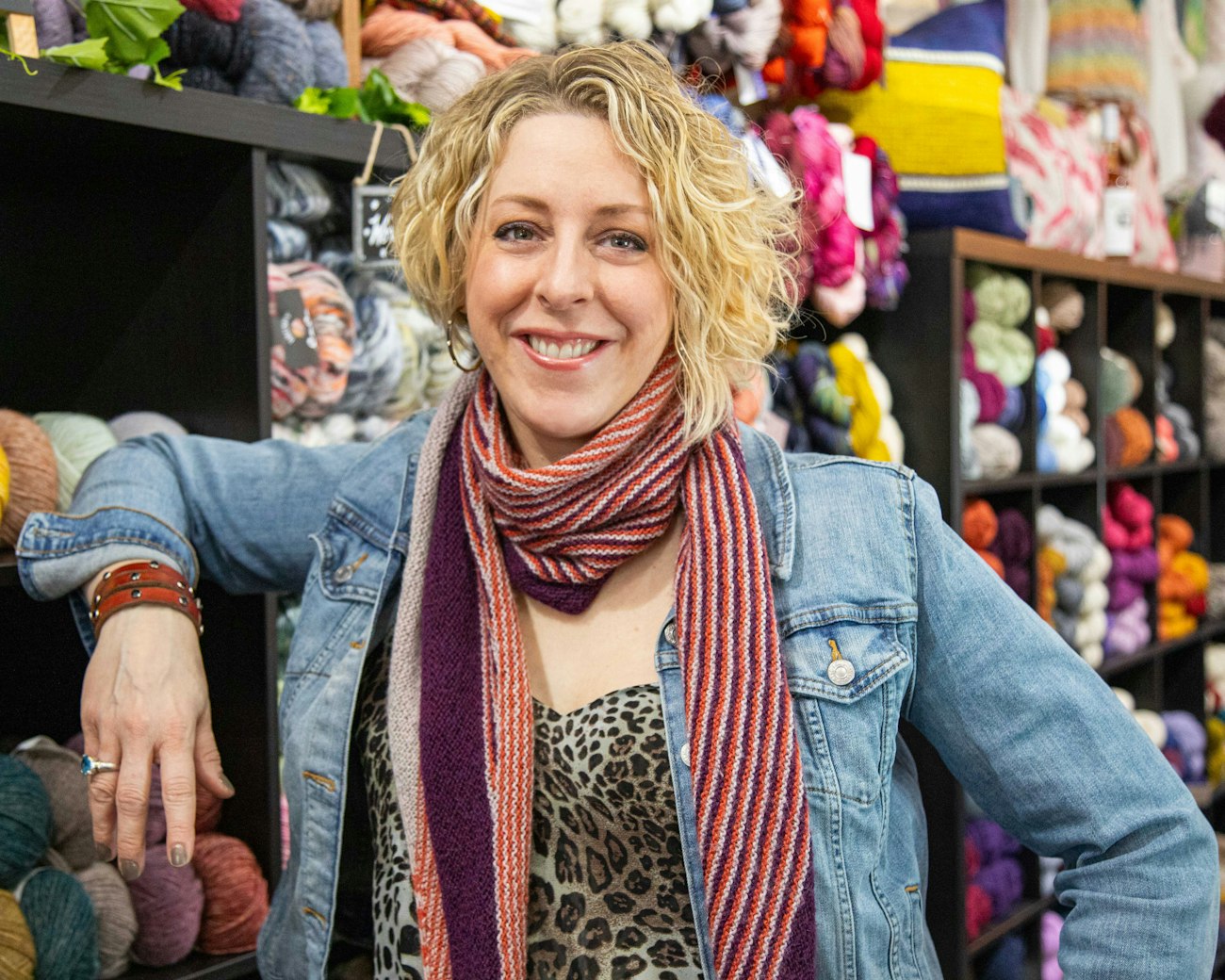 Jenny Monteleone stands in her shop, Rows of PurL.