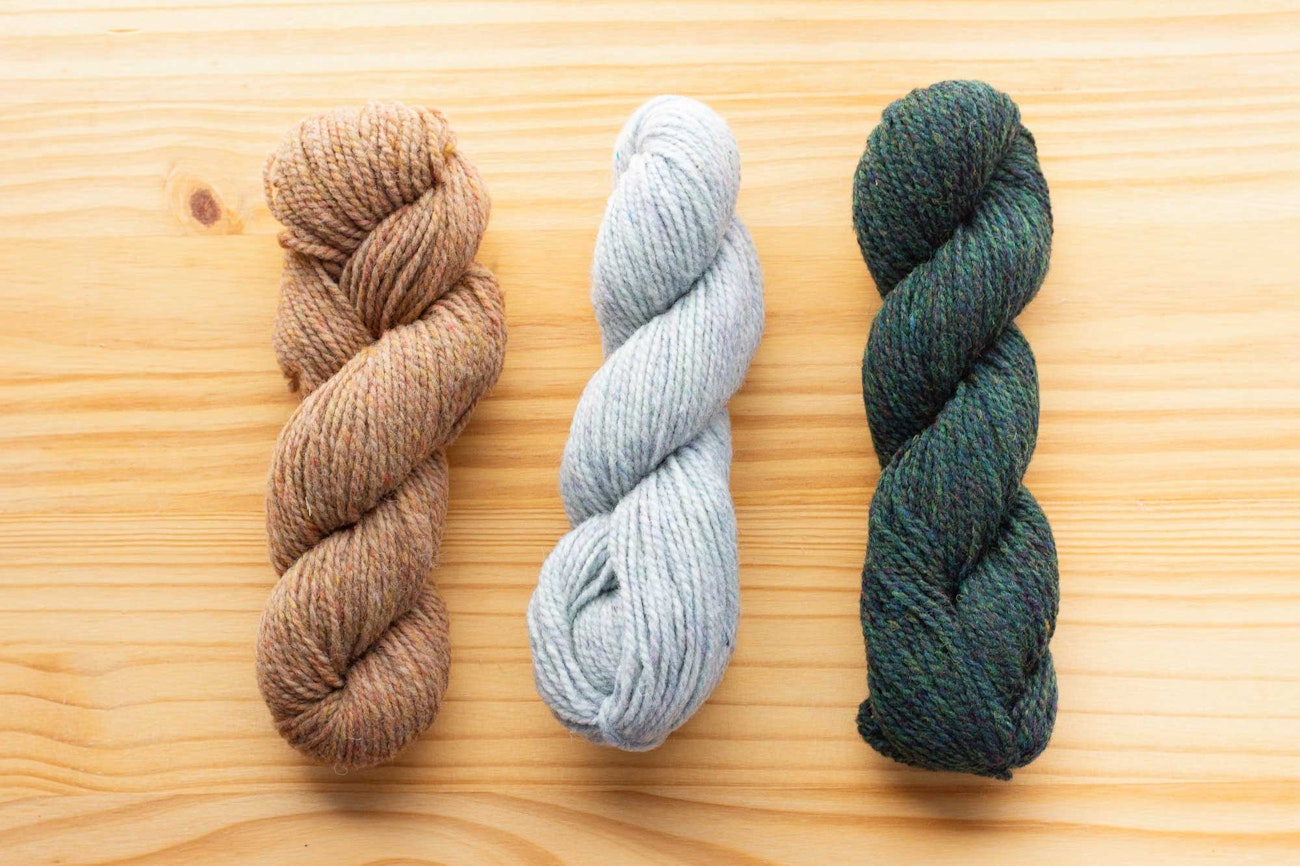 Each 1.75 ounce (50 g) skein of Watershed is about 110 yards (100 m). Shown left to right are Meadows, Birch Bark, and Mallard.