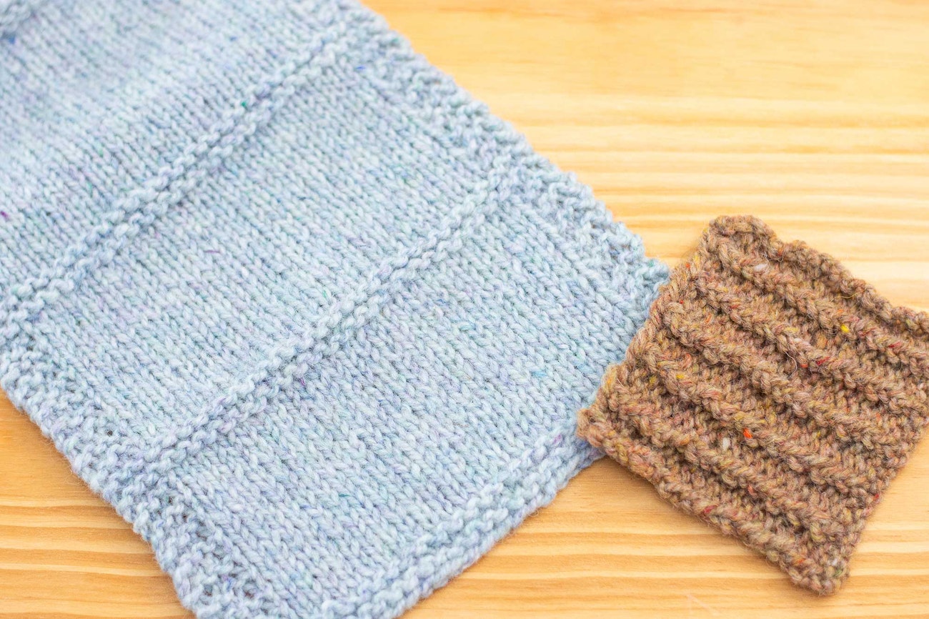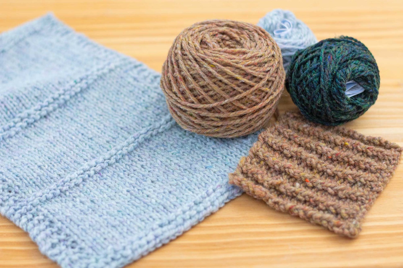 Upon closer inspection, Pamela’s large swatch in Birch Bark reveals flecks of blues, greens, and purples. See if you can spot bits of red, orange, and yellow in the smaller swatch, knit in the Meadows colorway.