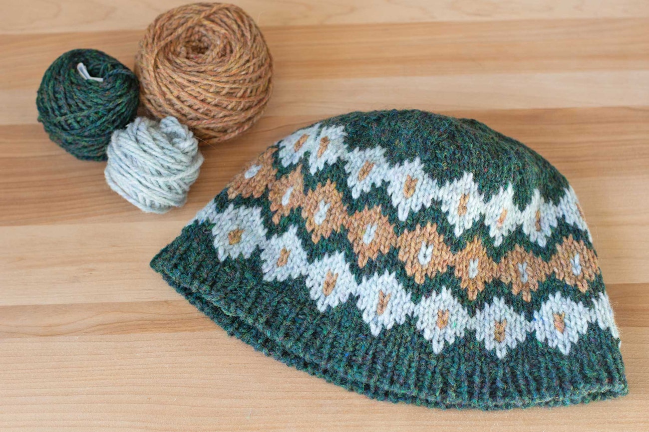 When I first saw it, I knew this yarn would be a fantastic choice for stranded colorwork. Because it has two plies, it has enough definition to show off the color motifs but still allows the stitches to blend with each other for a uniform fabric. And because Watershed is a lightweight woolen yarn, a colorwork garment knitted from it won’t be too heavy. I might have skipped the recommended swatching in the round (don’t tell the yarn police!) and cast on Tressa Weidenaar’s Homelands Hat. The result was a quick, fun knit—perfect for last-minute gifting.