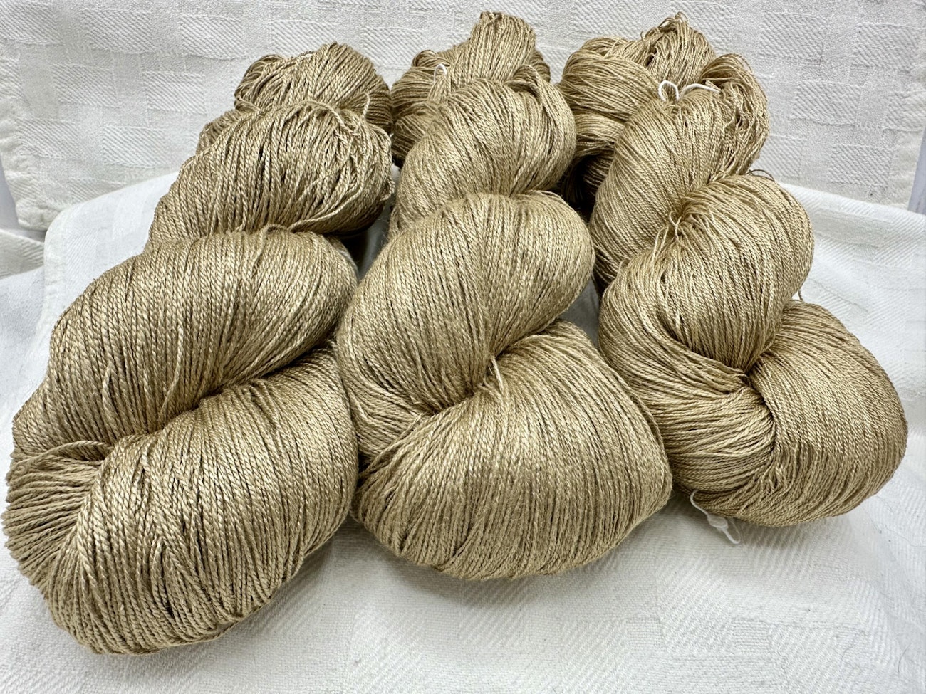 Muga silk yarns are perennial favorites. Muga silk is naturally a rich honey color. Muga silkworms are reared in forests. Muga silk is organic, as no pesticides are used. The climate for these special silkworms is limited to a small region in northeast India, the Assam state. Unfortunately, rising world temperatures have a very negative impact on these silkworms, reducing the viable silkworm cocoon crops. The Silk Board of India is attempting to relocate some muga silkworms to another region. While that might sound simple, in addition to finding the right climate and vegetation, these new areas lack generations of sericulture tradition. This photo of Muga silk skeins includes Carmela, Caramel, and Carmelina.