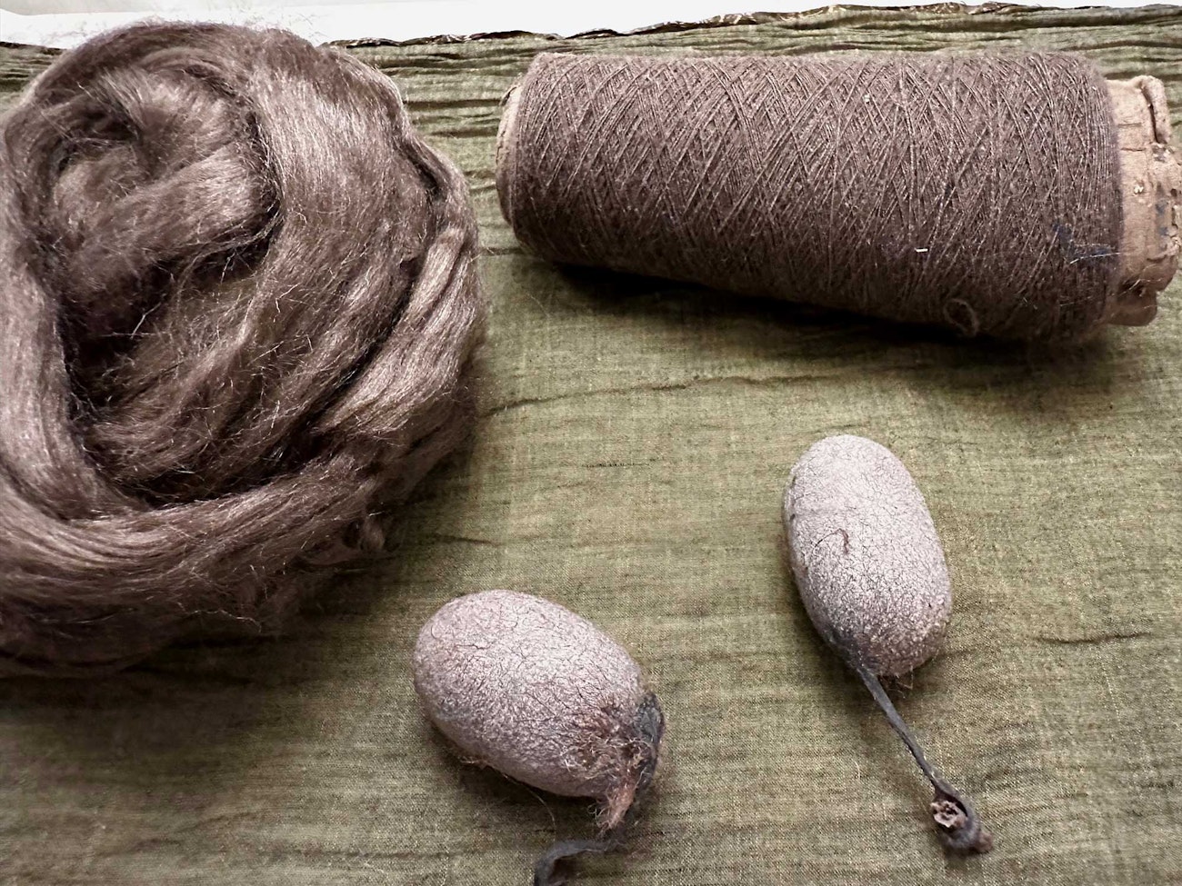 When collecting the cocoons, the peduncle often stays attached to the tree. But the peduncles that are gathered can be made into usable, short-staple fiber that can be spun. It’s a lengthy process, one that Karen Selk has written about for us. The short version is “boil it, beat it, card it”, then repeat the carding multiple times. This yarn has lots of twist energy—it will shrink when washed. The samples we’ve made have paired Kinetta with other silk yarn—after wet finishing, the cloth has a very sturdy feel.